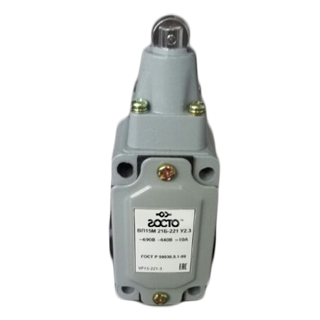 Выключатель путевой ВП15-К-21-Б-221 представляет собой двухполюсный электрический аппарат (общего назначения прямого действия с самовозвратом) базового типа крепления, оснащенный приводом в виде толкателя с роликом.